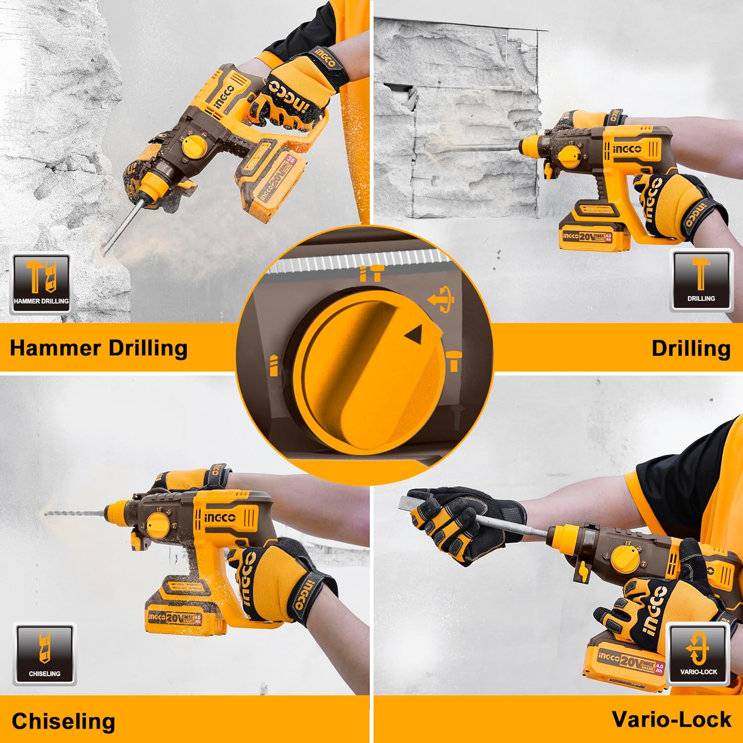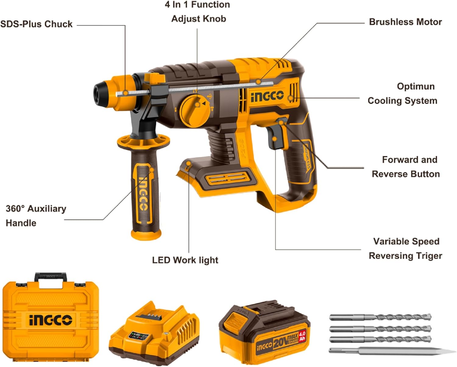 Matrapiku SDS-Plus me bateri INGCO është i pajisur me motor pa karboncina, dorezë për rregullimin e funksionit 4-në-1, me 1100 RPM dhe 5400 BPM, ofron fuqi prej 2.0J. Përfshin 3 copa maja shpimi dhe 1 daltë, si dhe një bateri 4.0Ah me karikues për punë të ndërprerë dhe efikase.