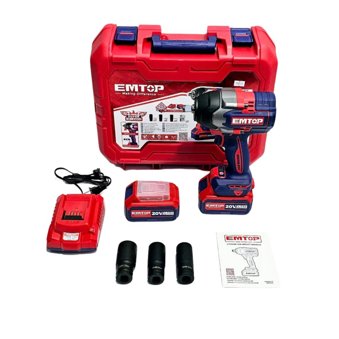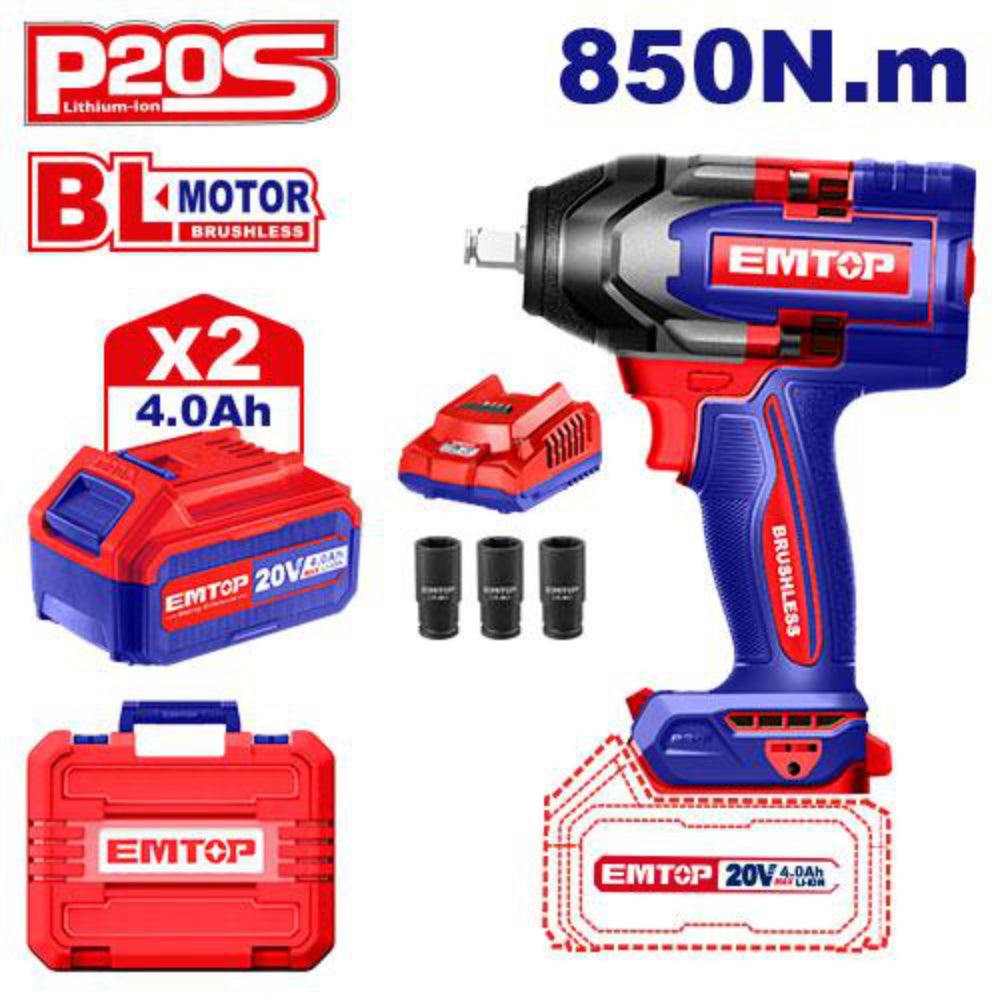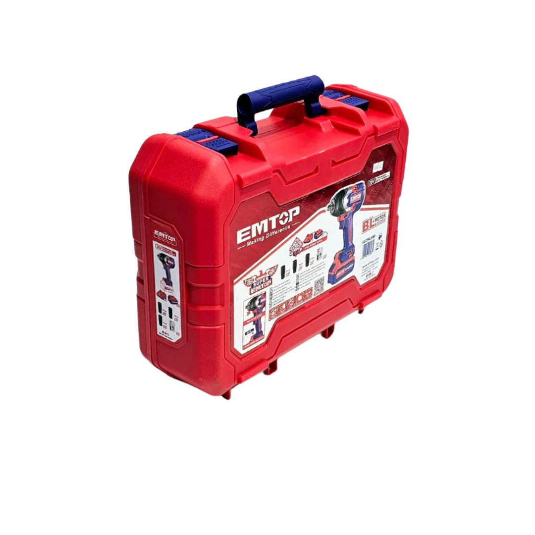 Pistoletë dadicekesh EMTOP pa karboncina është një mjet i fuqishëm dhe fleksibël, i dizajnuar për punë të rënda. Ai ka motor pa karboncina që siguron performancë më të qëndrueshme, jetëgjatësi të zgjatur dhe mirëmbajtje minimale. Sistemi i transmetimit katror 1/2" lehtëson lidhjen e sigurtë, ndërsa drita LED e integruar përmirëson dukshmërinë në kushte të errëta dhe ofron informacion mbi nivelin e baterisë. Ideal për riparime makinash, ndërtime dhe aplikime profesionale. Karakteristikat përfshijnë tension 20V, shpejtësi të ndryshme deri në 2400 rpm, çift rrotullues deri në 850Nm, dy bateri 4.0Ah, karikues të shpejtë dhe tre koka në madhësi 22, 24 dhe 27mm, të gjitha në një çantë plastike praktike.