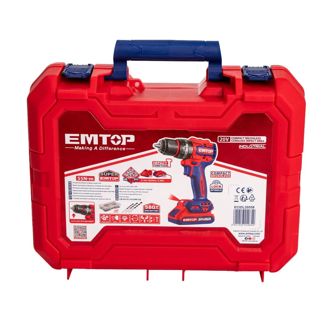 Motori brushless pa karboncina i modelit ECIDL20558 operon me tension 20V dhe ofron shpejtësi pa ngarkesë: 0-500 dhe 0-2000 rpm, me goditje prej 30000 bpm dhe torque prej 55Nm. Ai disponon mandrinë metalike me kapacitet 13mm dhe ofron 22+1+1 cilësime për kontroll të saktë, si dhe ingranazh mekanik me dy shpejtësi për performancë të përshtatshme. Funksioni i bllokimit të boshtit rrit stabilitetin gjatë përdorimit. Pajisja ka dritë pune LED të integruar dhe tregues LED për statusin e baterisë. Në paketim përfshihen dy bateri 2.0Ah (EBPK20011), karikuesi EFCR20200, 47 aksesorë, tre punto për beton dhe një valixhe plastike për organizim dhe transport të lehtë.